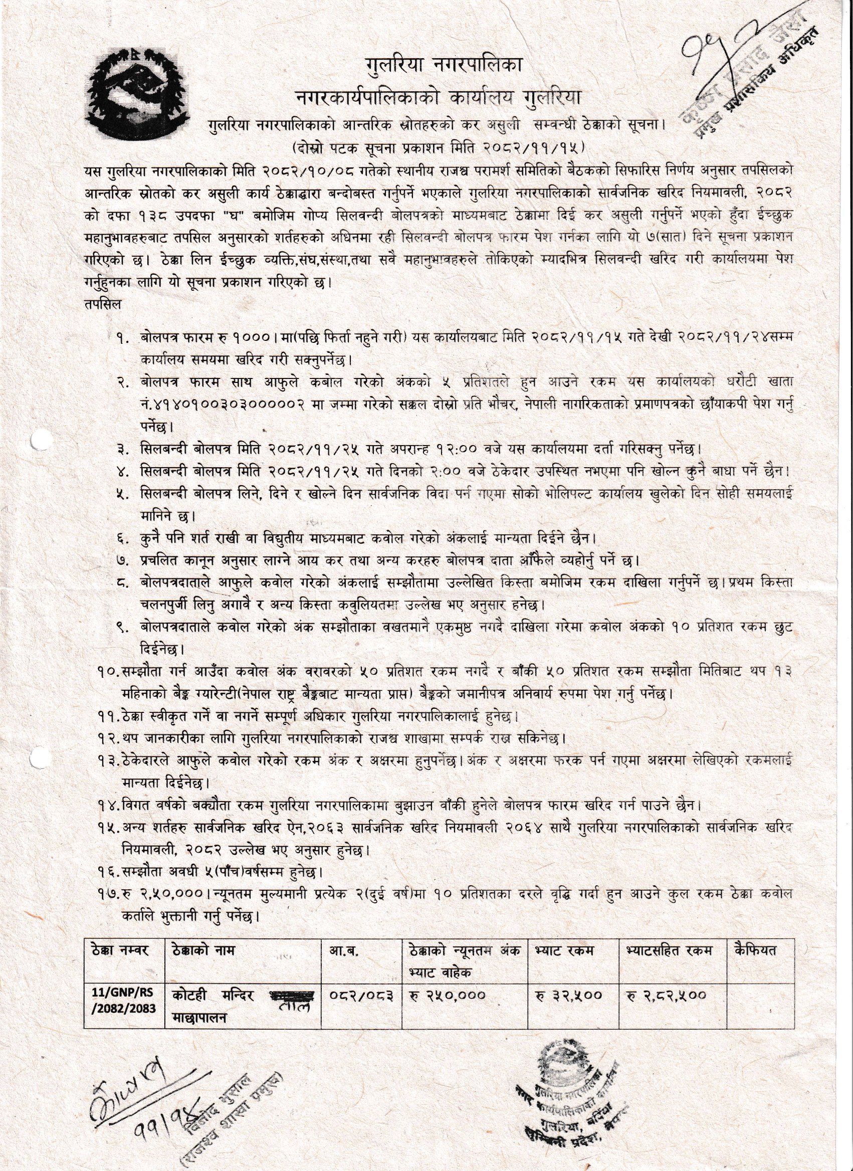गुलरिया नगरपालिकाको आन्तरिक स्रोतहरुको कर असुली सम्बन्धी ठेक्काको सूचना!!!