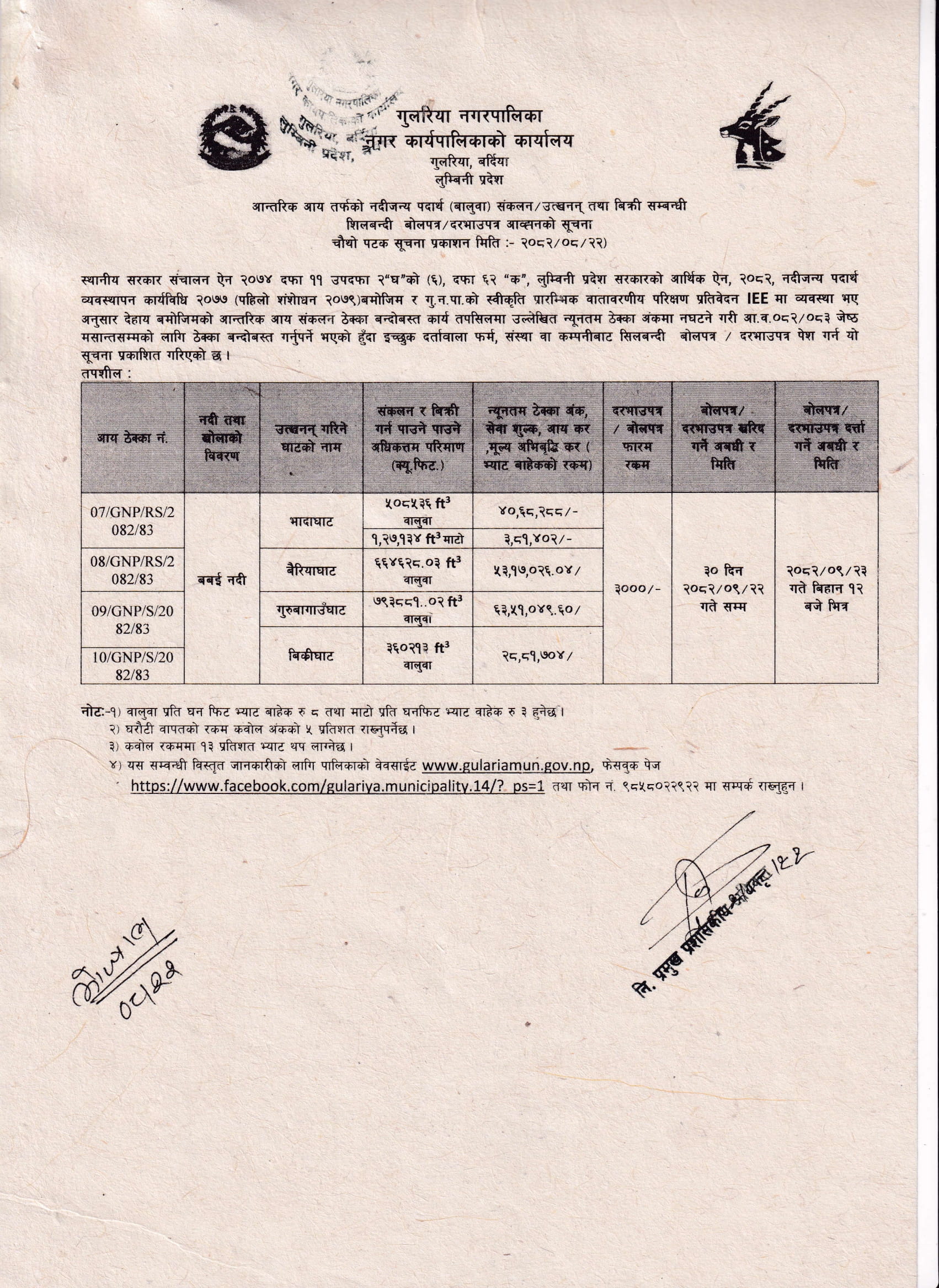 » आन्तरिक आय तर्फको नदीजन्य पदार्थ (बालुवा) संकलन/उत्खनन् तथा बिक्री सम्बन्धी शिलबन्दी बोलपत्र/दरभाउपत्र आव्हानको चौथो पटक प्रकाशित सूचना!!!