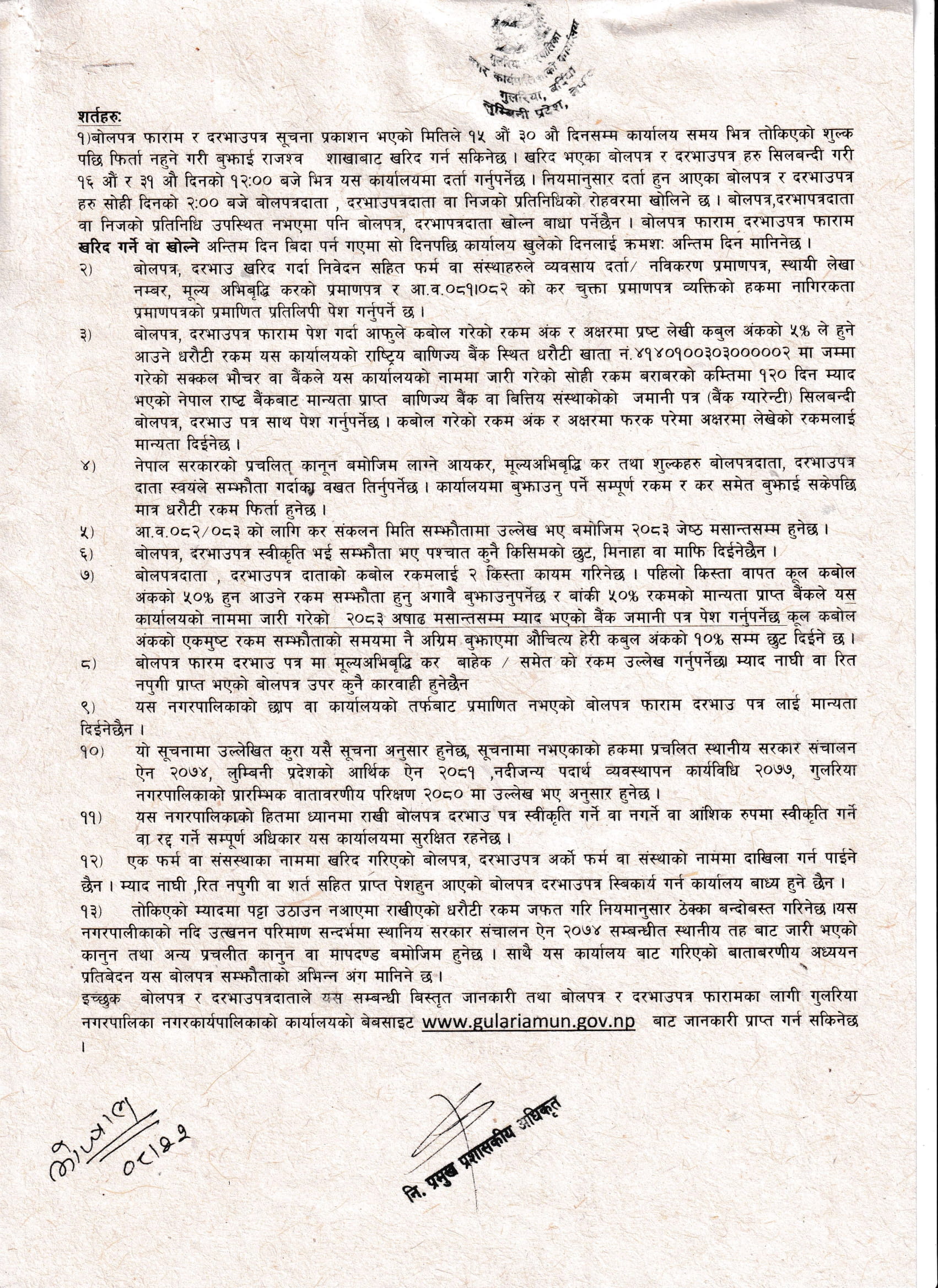 गुलरिया नगरपालिकाको आन्तरिक स्रोतहरुको कर असुली सम्बन्धी ठेक्काको चौथो पटक प्रकाशित सूचना!!!
