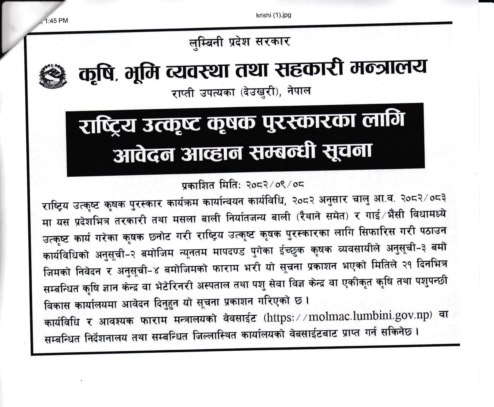 कृषि, भूमि व्यवस्था तथा सहकारी मन्त्रालय राप्ती उपत्यका (देवखुरी) बाट प्रकाशित राष्ट्रिय उत्कृष्ट कृषक पुरस्कारका लागि आवेदन आव्हान सम्बन्धी सूचना!!!