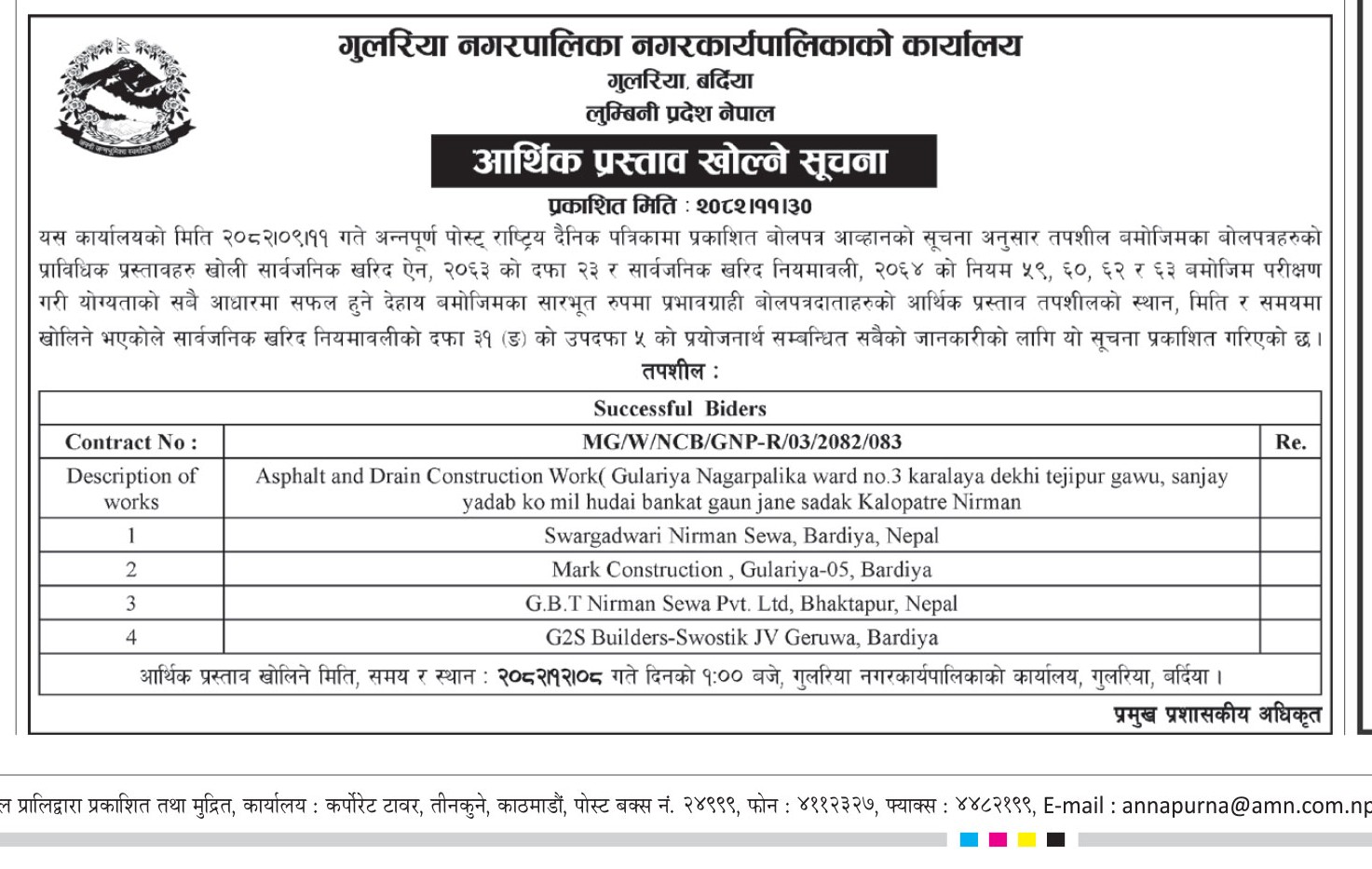 आर्थिक प्रस्ताव खोल्ने सम्बन्धी सूचना!!!