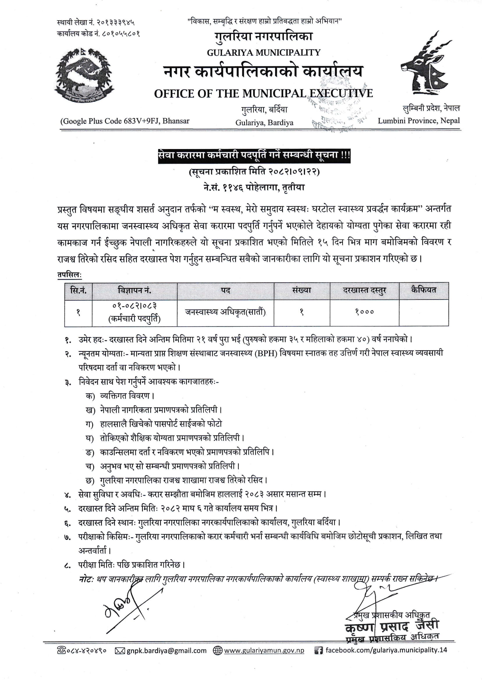 जनस्वास्थ्य अधिकृत(सातौं) सेवा करारमा पदपूर्ति गर्ने सम्बन्धी सूचना!!!