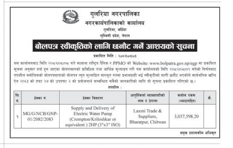 बोलपत्र स्विकृतका लागि छनौट गर्ने आशयको सूचना!!!