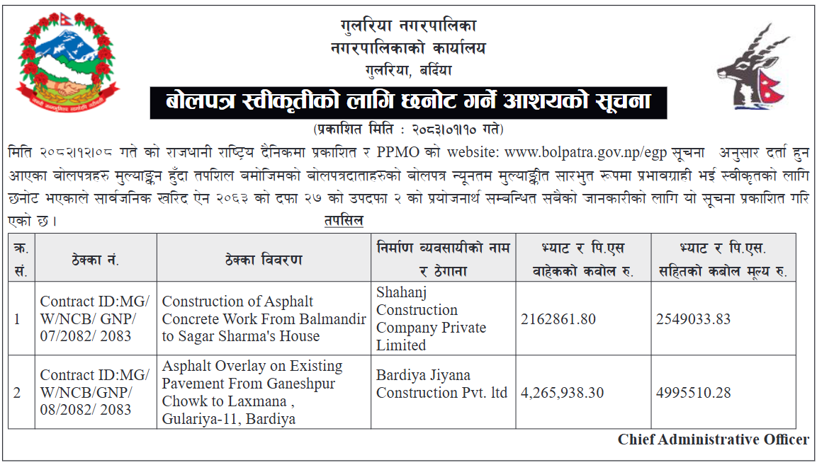 बोलपत्र स्वीकृतको लागि छनोट गर्ने आशयको सूचना!!!