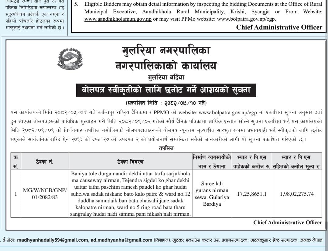 बोलपत्र स्वीकृतीको लागि छनोट गर्ने आशयको सूचना!!!